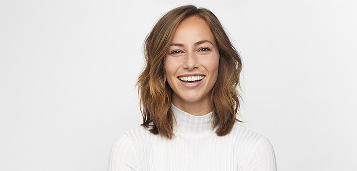 Young woman smiling while she is wearing a white mock turtleneck sweater